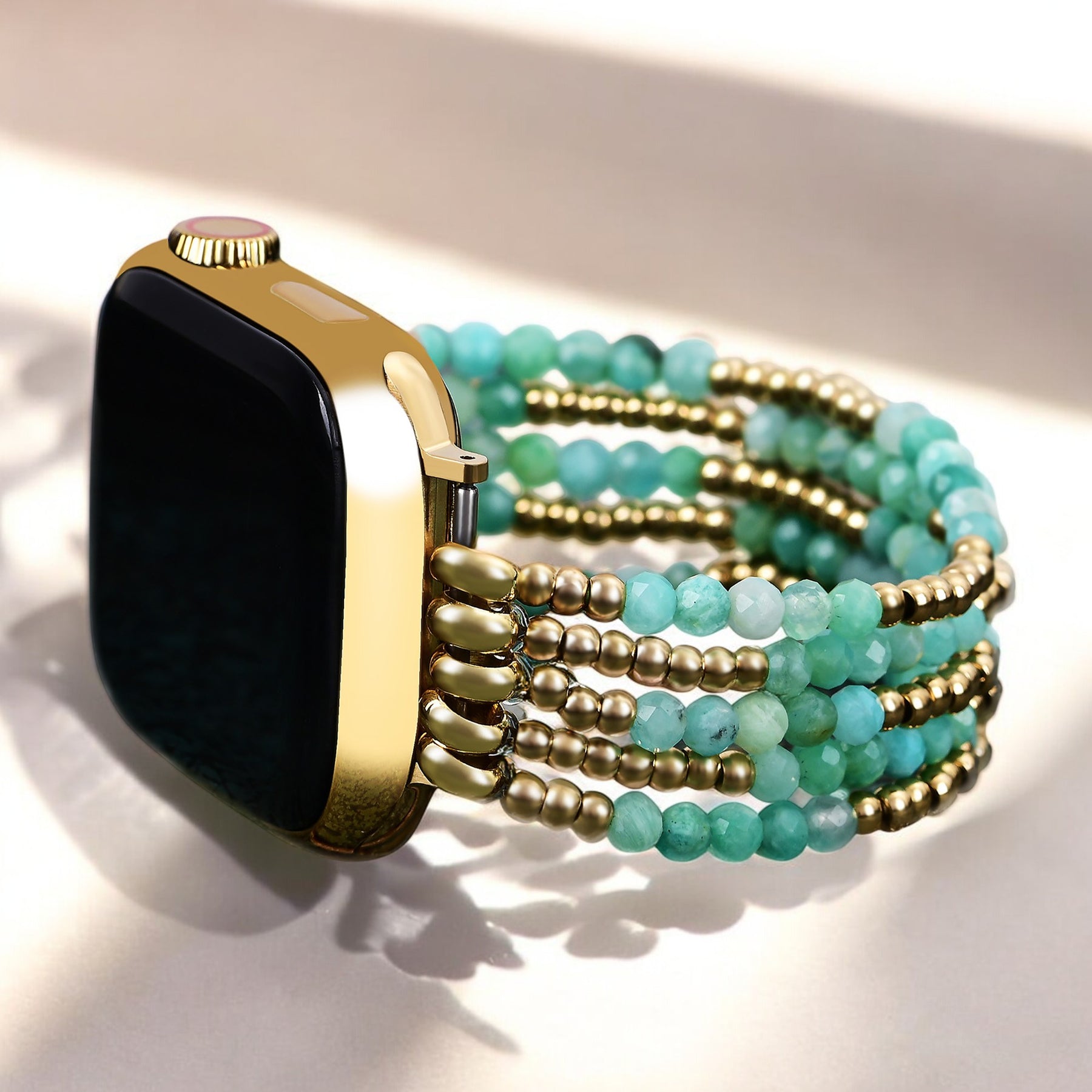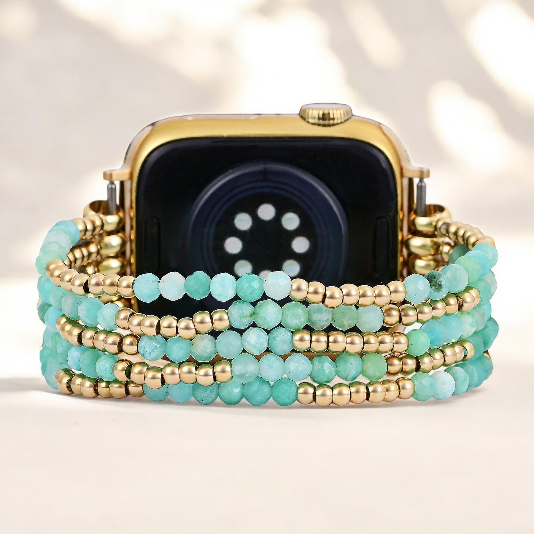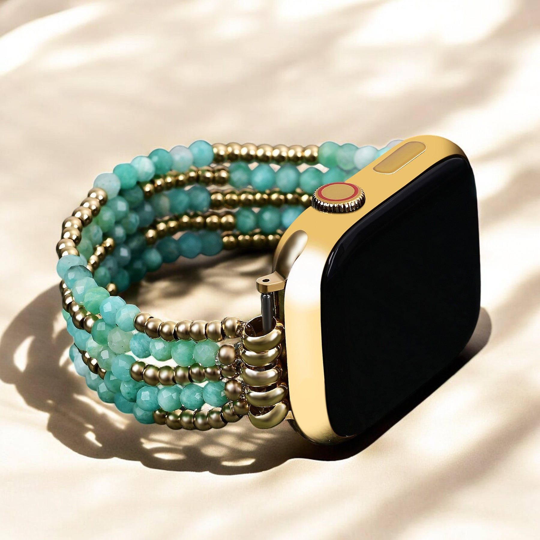 استمتع بالطاقة المهدئة للأمازونيت مع سوار ساعة آبل المطاطي المتوهج من الأمازونيت. يتميز هذا السوار النابض بالحياة بحبات أمازونيت زرقاء زاهية ولمسات ذهبية، مما يخلق مظهراً مبهجاً ومنعشاً.