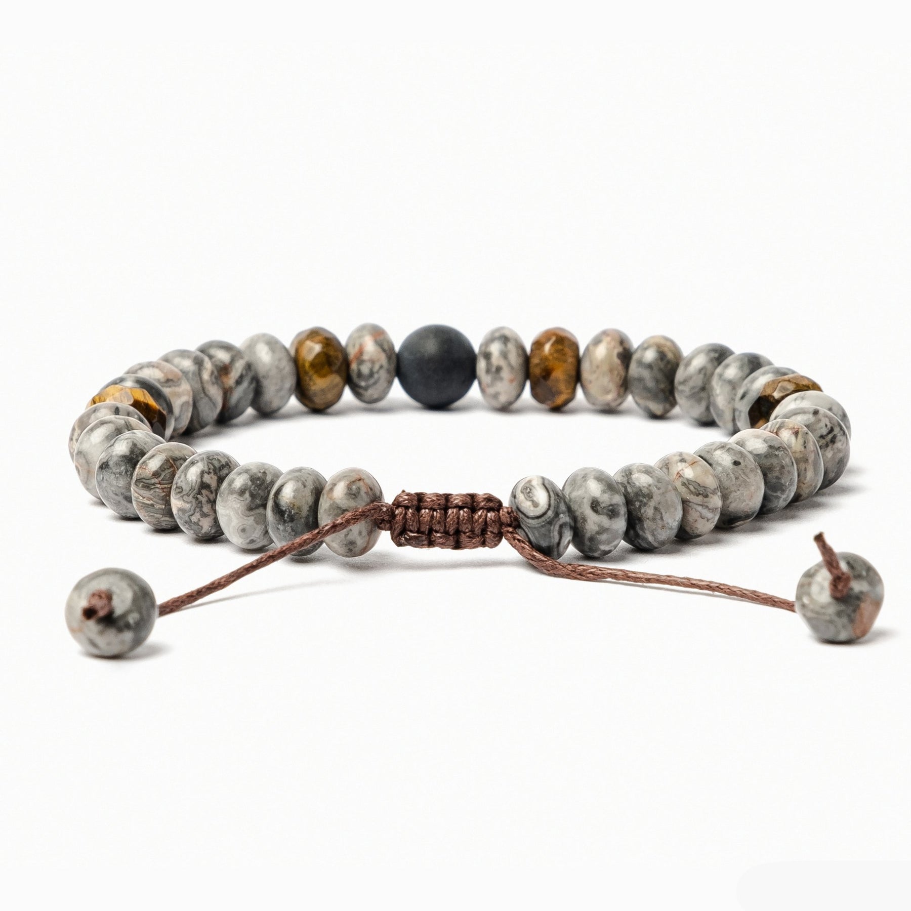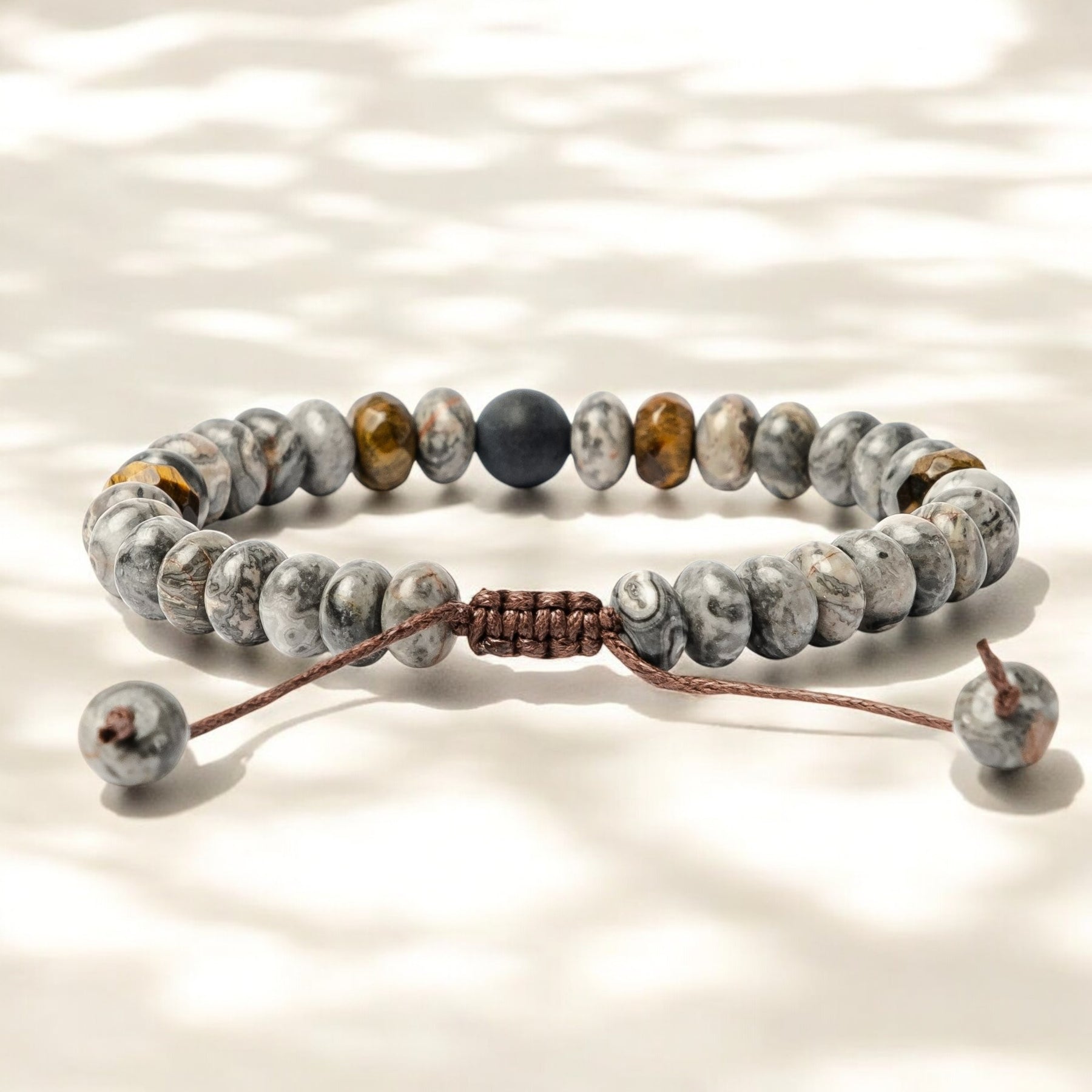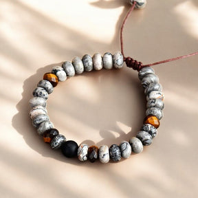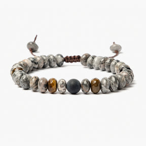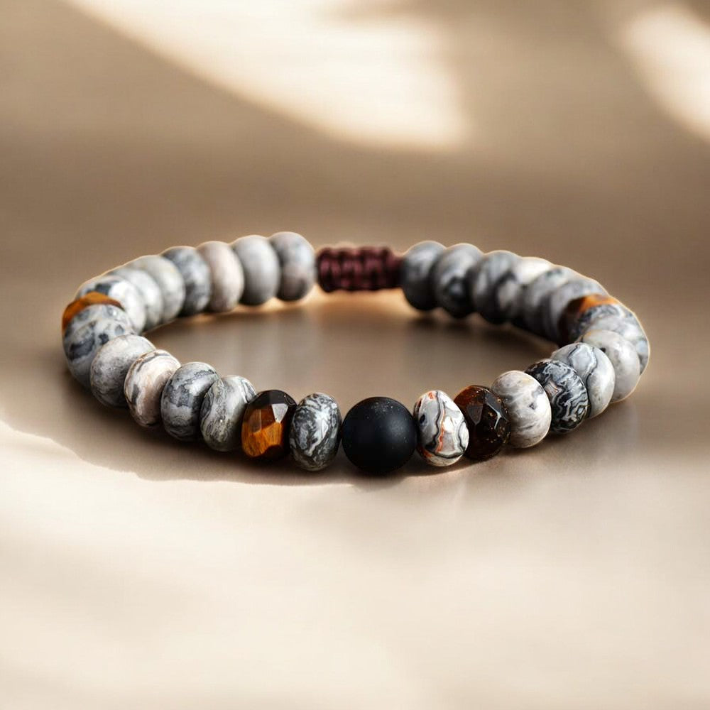 سوار جاسبر وحجر عين النمر للرجال يجمع بين حجرتين قويتين معروفتين بخصائصهما في التثبيت والحماية. يعزز الجاسبر الاسترخاء والاستقرار، بينما يشجع حجر عين النمر على الشجاعة والوضوح واتخاذ القرارات بثقة.