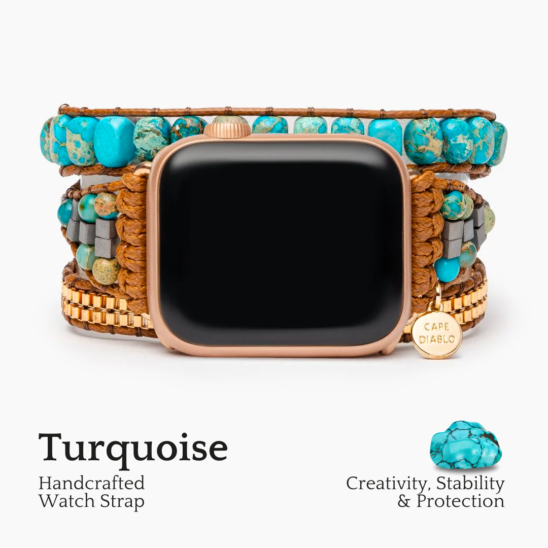 Das Bonny Türkis Apple Watch Armband ist ein wunderschönes Accessoire, das die schützende und stabilisierende Energie von Türkis nutzt. Bekannt dafür, Kommunikation, Intuition und Chakren-Balance zu verbessern, bringt dieses Armband innere Ruhe und öffnet die Hals- und Herzchakren – perfekt, um deine kreative Vision und Intuition zu fördern.