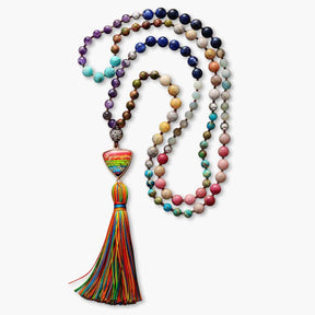 Die Chakra Charm Quasten-Halskette vereint die beruhigenden Kräfte von Amethyst, die schützende Energie von Jaspis, die intuitive Führung von Türkis und die mitfühlende Heilung von Rhodonit. Jeder Stein unterstützt einen ausgeglichenen Energiefluss, fördert Frieden, Kreativität und Liebe und harmonisiert dabei Ihre Chakren.