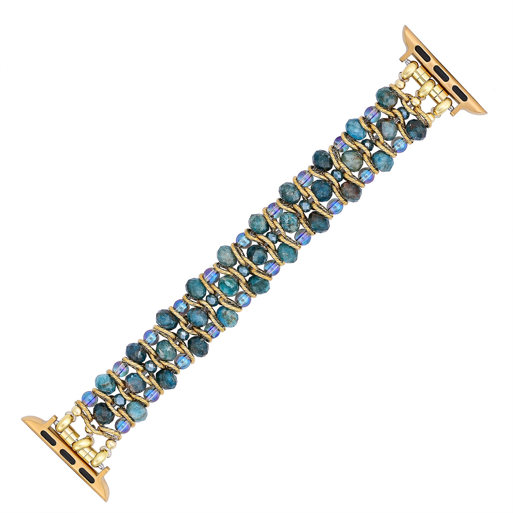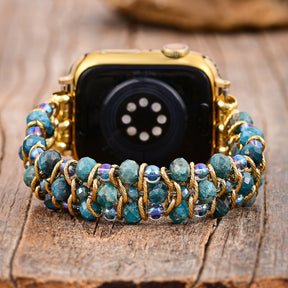 Tauchen Sie ein in die Schönheit der Küste mit dem Crystal Shores Kettenarmband für die Apple Watch. Mit lebendigen Apatitsteinen und schimmernden Kristallperlen ist dieses elegante Armband wunderschön mit reichhaltigen goldfarbenen Kettengliedern kombiniert und fängt die ruhige Essenz der Meeresküste bei Sonnenuntergang ein.