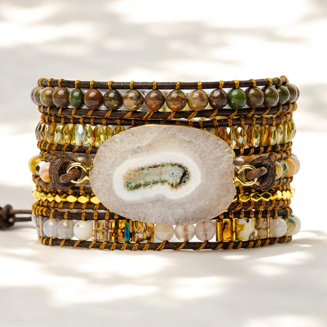 - Materialien: Achat, Grüner Opal, Druzy, Echtes Leder und Zinklegierung