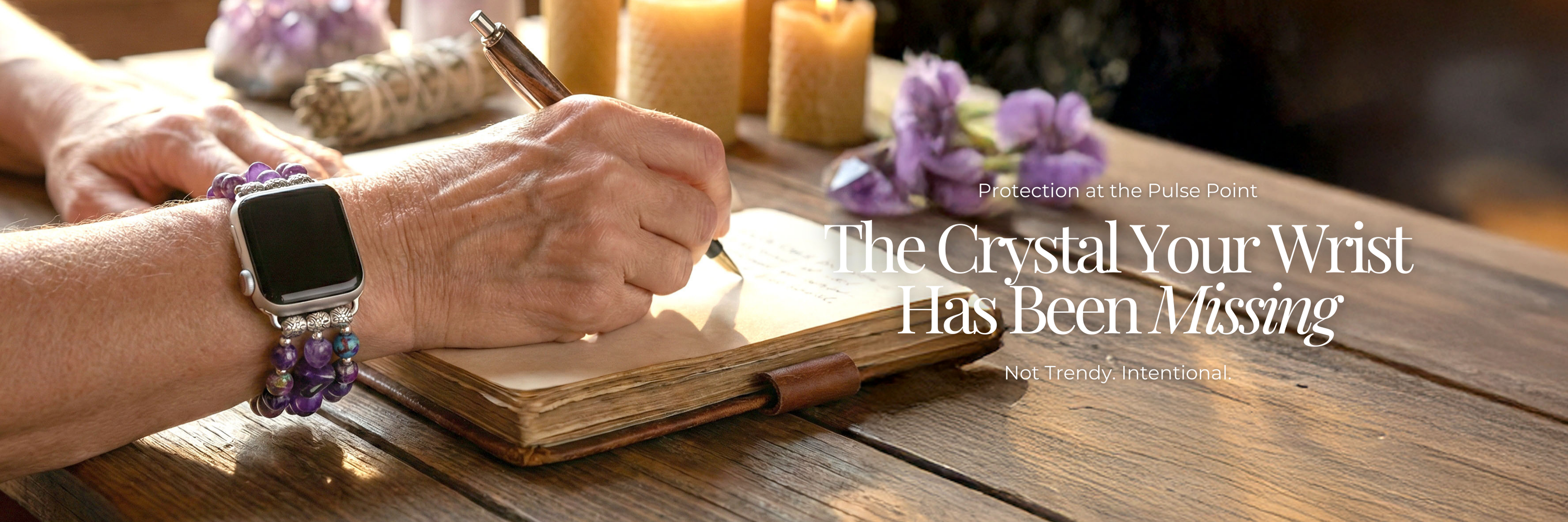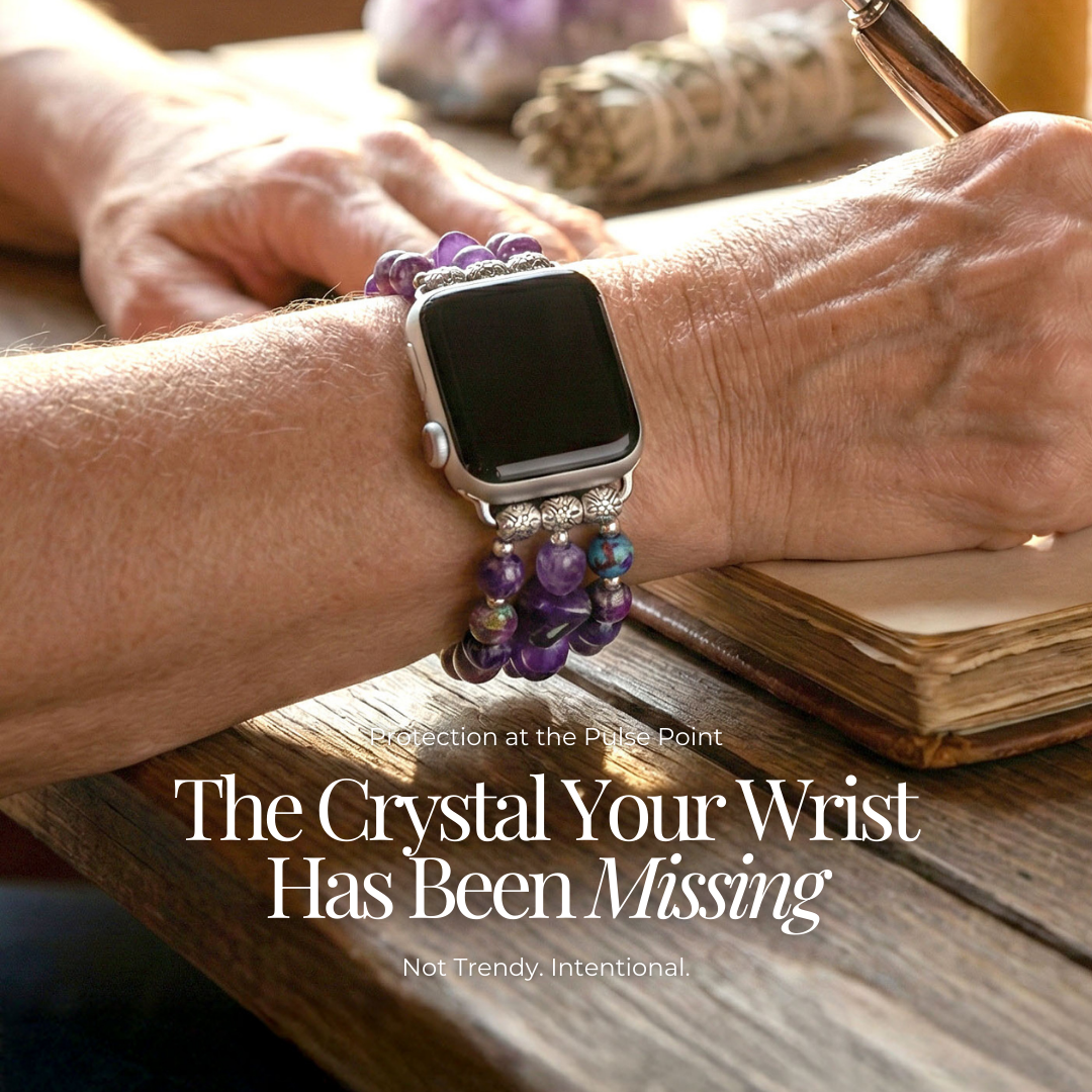 Comprendes la importancia de la muñeca: el flujo, el meridiano, los cambios sutiles. Lo que descansa allí debe sentirse en armonía. Nuestras correas están elaboradas con piedras auténticas, cuidadosamente seleccionadas y respetuosamente ensambladas. No es una moda pasajera de cristales. No es simbolismo producido en masa.