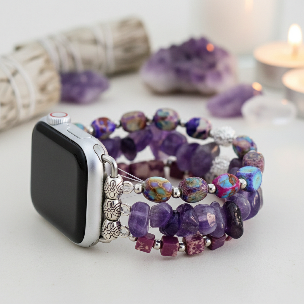 Cada correa está elaborada con piedras reales escogidas por su presencia y propiedades — ensambladas con cuidado, diseñadas para descansar en el punto del pulso con un apoyo silencioso. Cada pieza es hecha a mano — ninguna es idéntica. Cuando una piedra te llama, confía en esa conexión