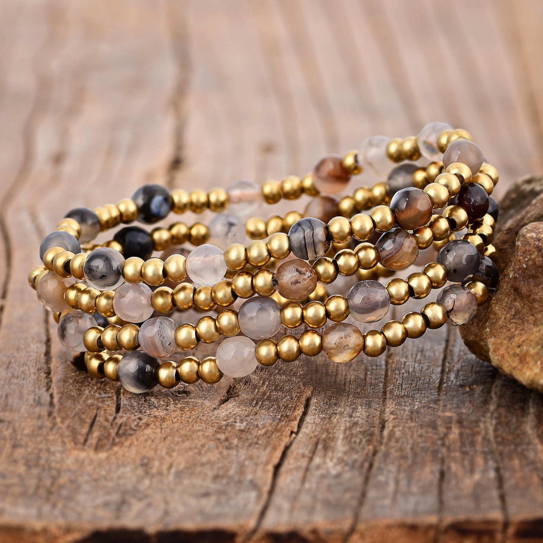 - Materiales: Ágata, cuentas de latón, acero inoxidable con baño de oro de 14K