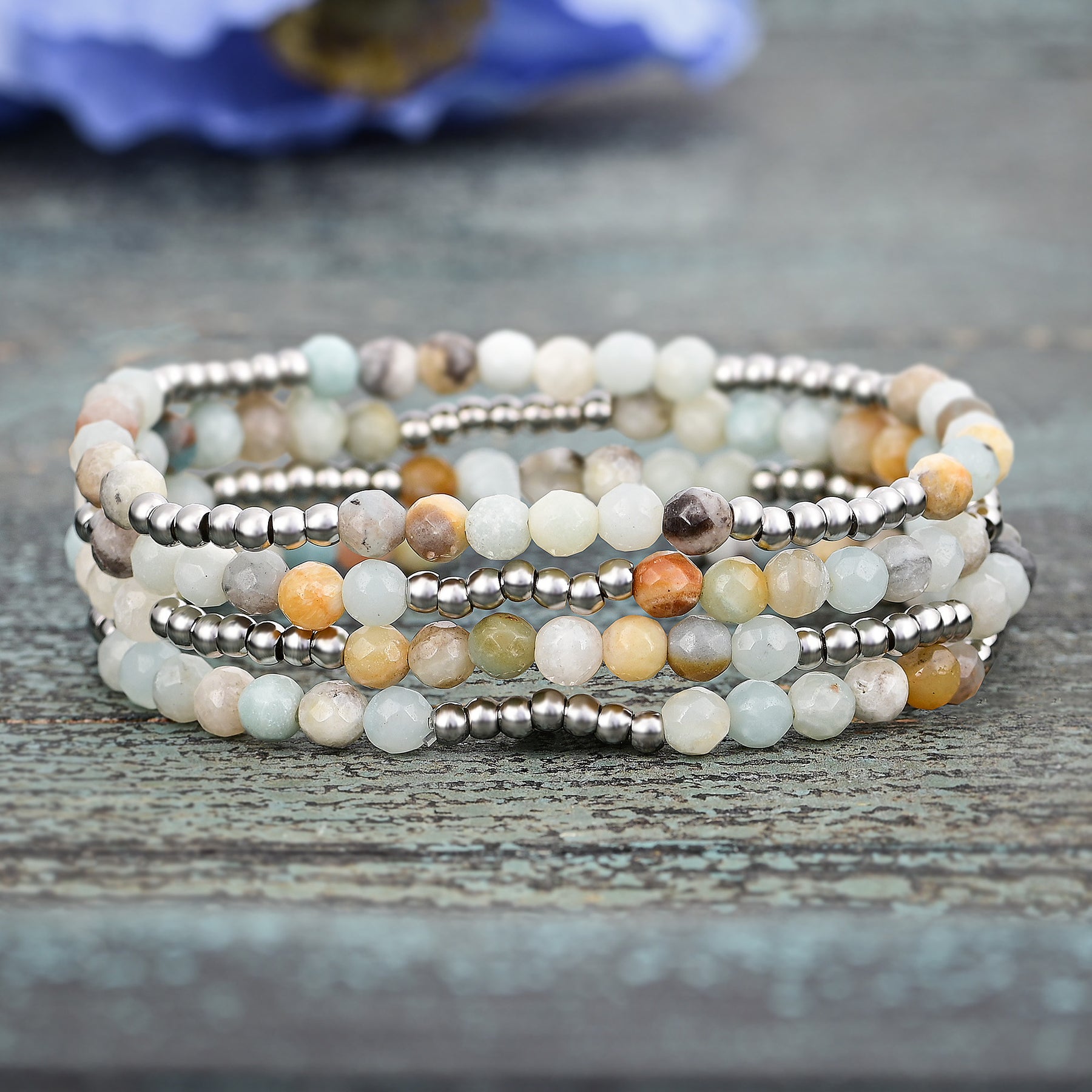 - Materiales: Amazonita, Cuentas de Latón, Acero Inoxidable