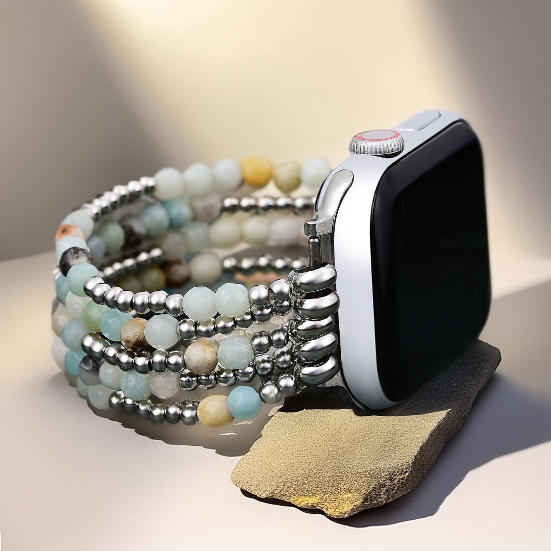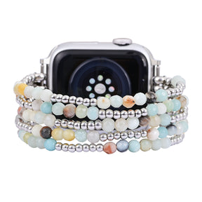 Experimenta la energía calmante de la amazonita con la correa Amazonite Brilliance Stretch para Apple Watch. Esta vibrante pulsera presenta cuentas de amazonita azul brillante y acentos dorados, creando un aspecto alegre y estimulante.