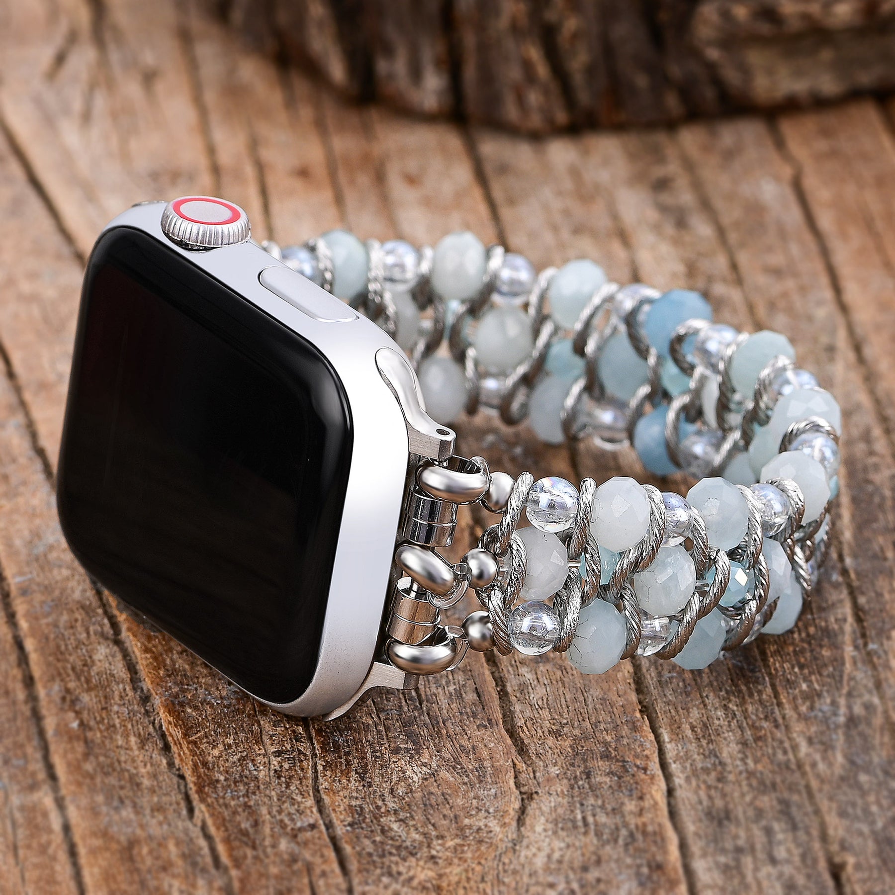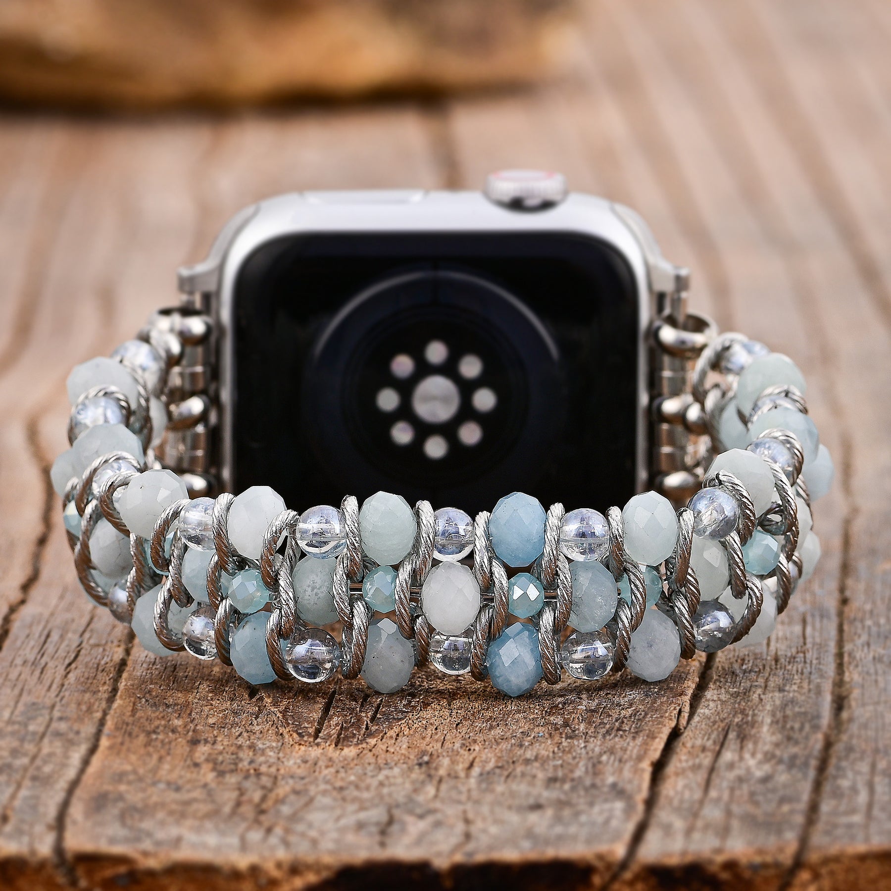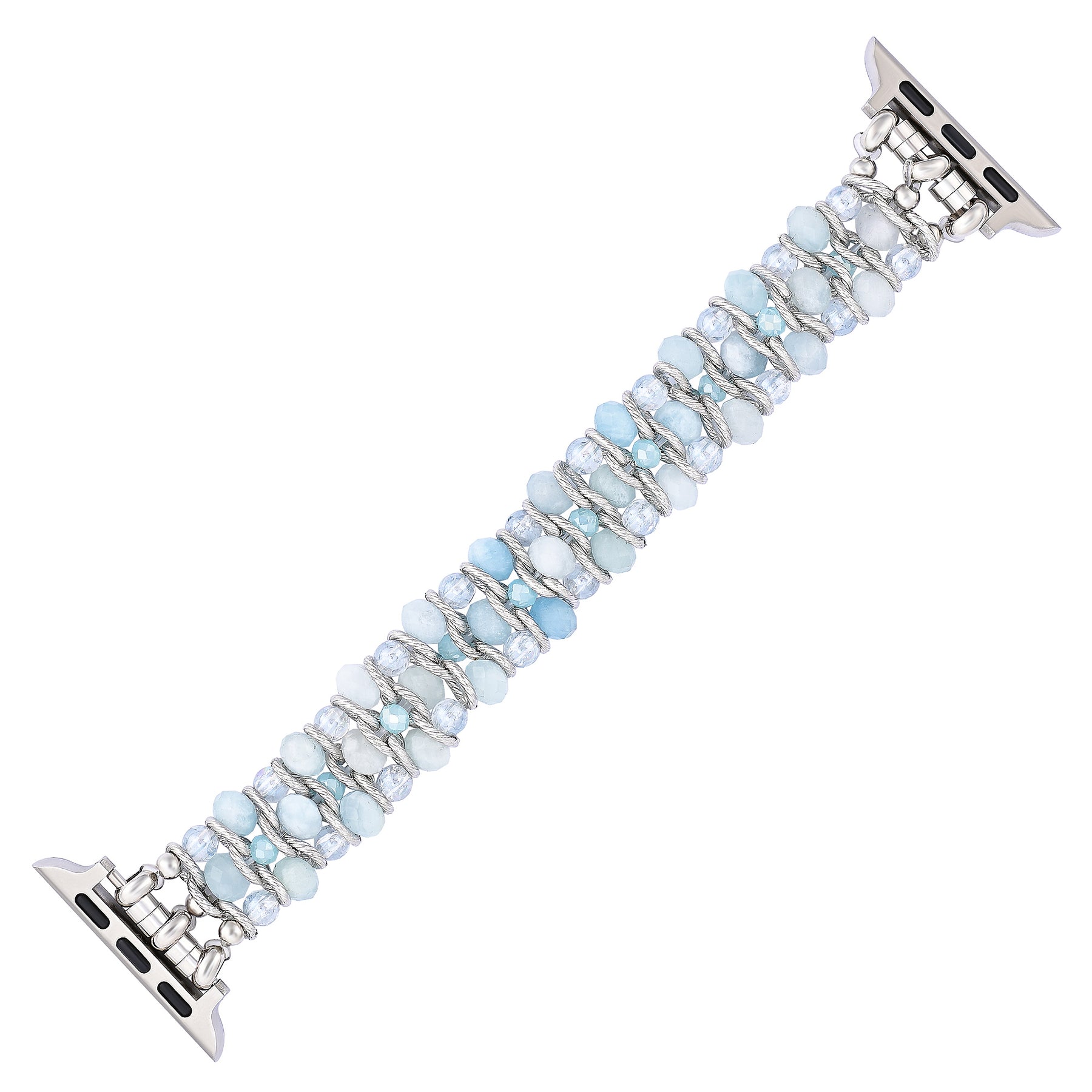 Disfruta de la tranquila belleza del mar con la correa trenzada de zafiro aguamarina para Apple Watch. Con piedras de aguamarina relajantes y cuentas de cristal brillantes, esta correa se complementa con eslabones de cadena en tono plateado elegante, capturando el resplandor sereno de las aguas oceánicas.
