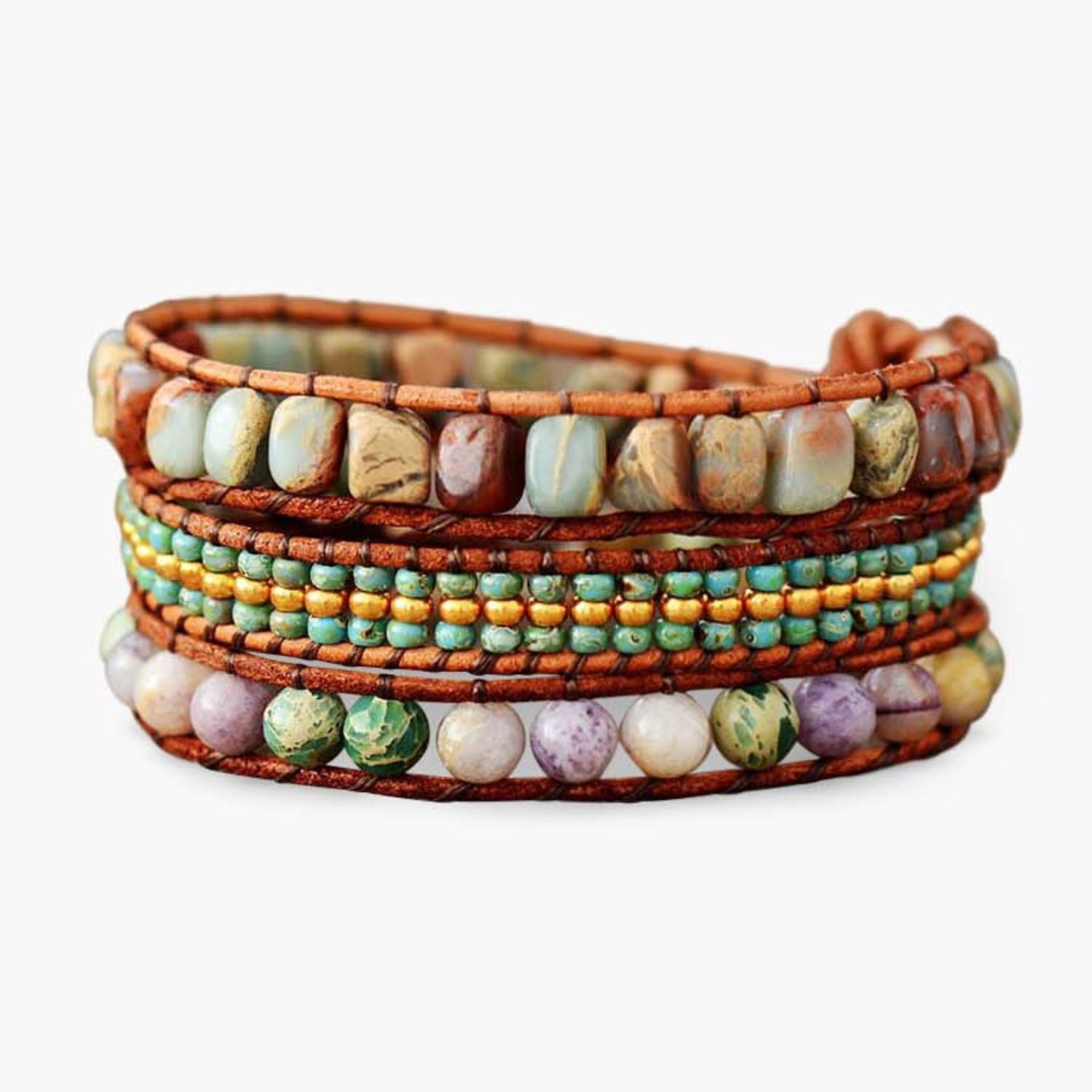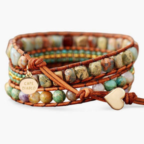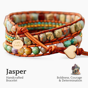 - Materiales: Jaspe, Cuentas de Semilla, Cristal, Cuero Genuino, Aleación