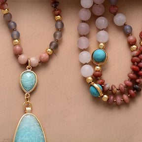 - Materiales: Jaspe, Cuarzo Rosa, Howlita Turquesa, Amazonita, Aleación de Zinc