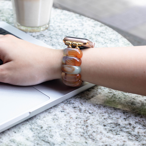Captura la calidez y belleza de una impresionante puesta de sol con la correa Golden Dusk Agate Stretch para Apple Watch. Diseñada con una armoniosa mezcla de piedras en naranja quemado, crema suave y verde terroso, esta correa evoca el resplandor tranquilo del sol poniente mientras se funde en el horizonte.