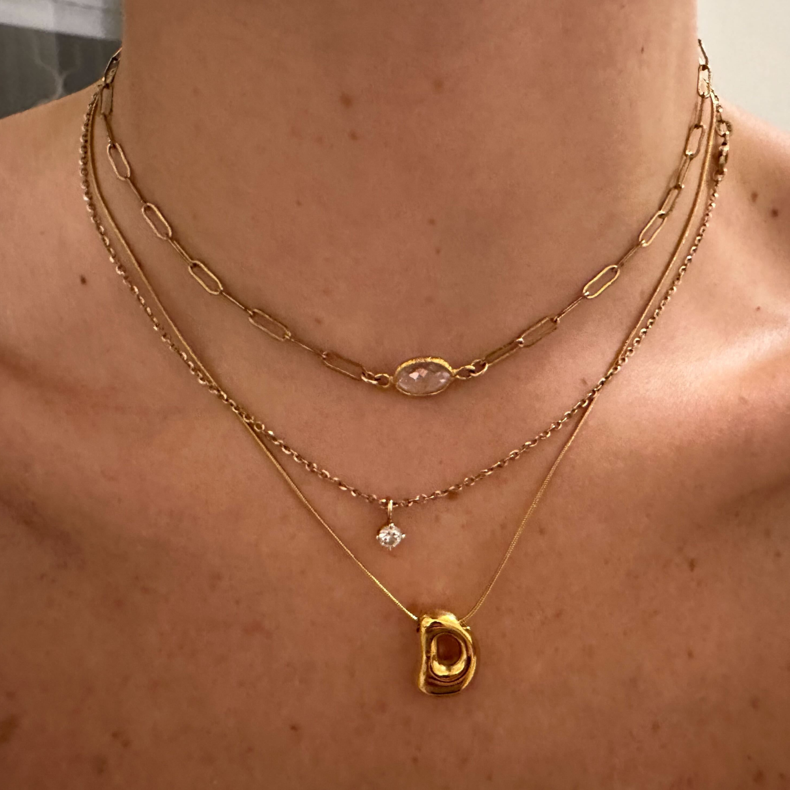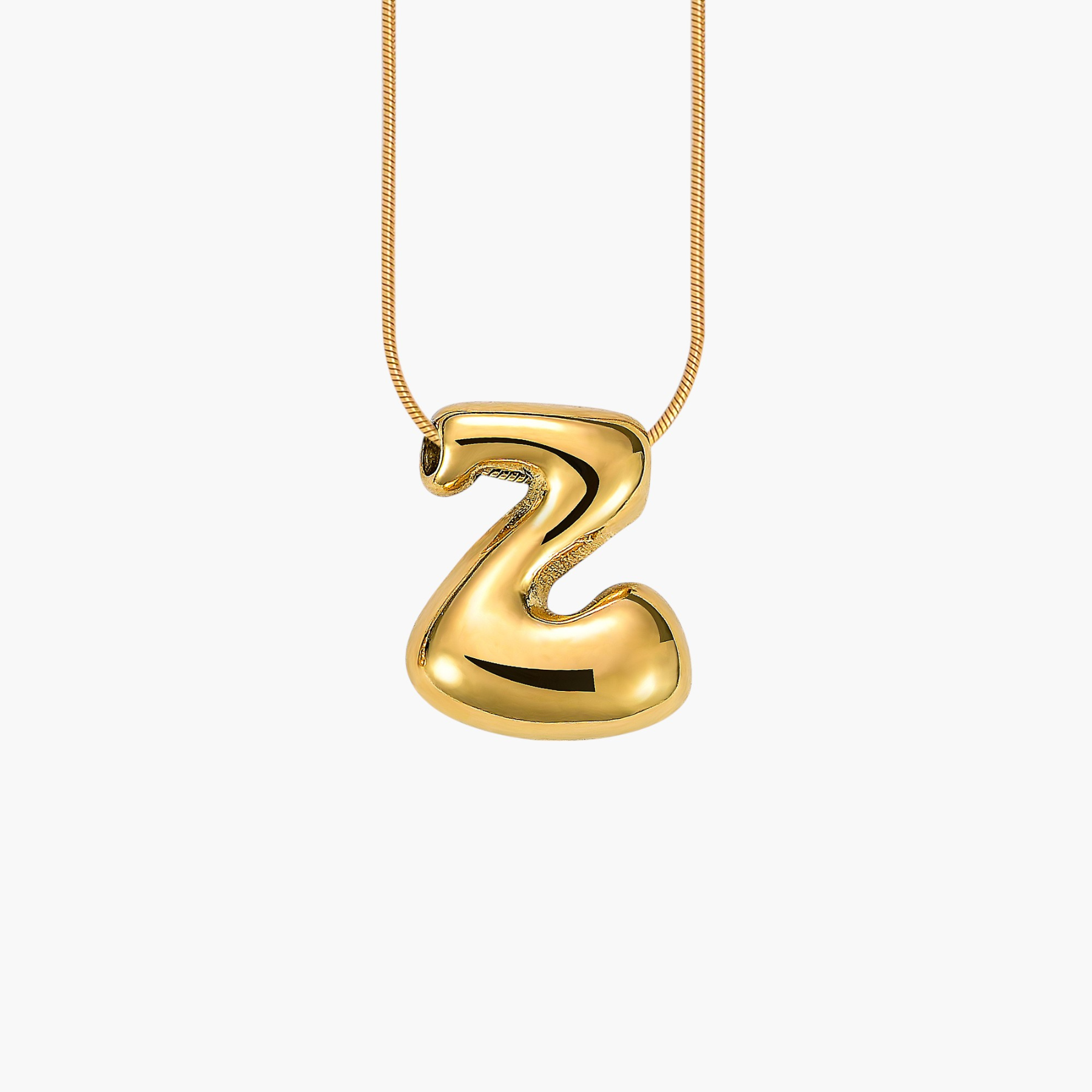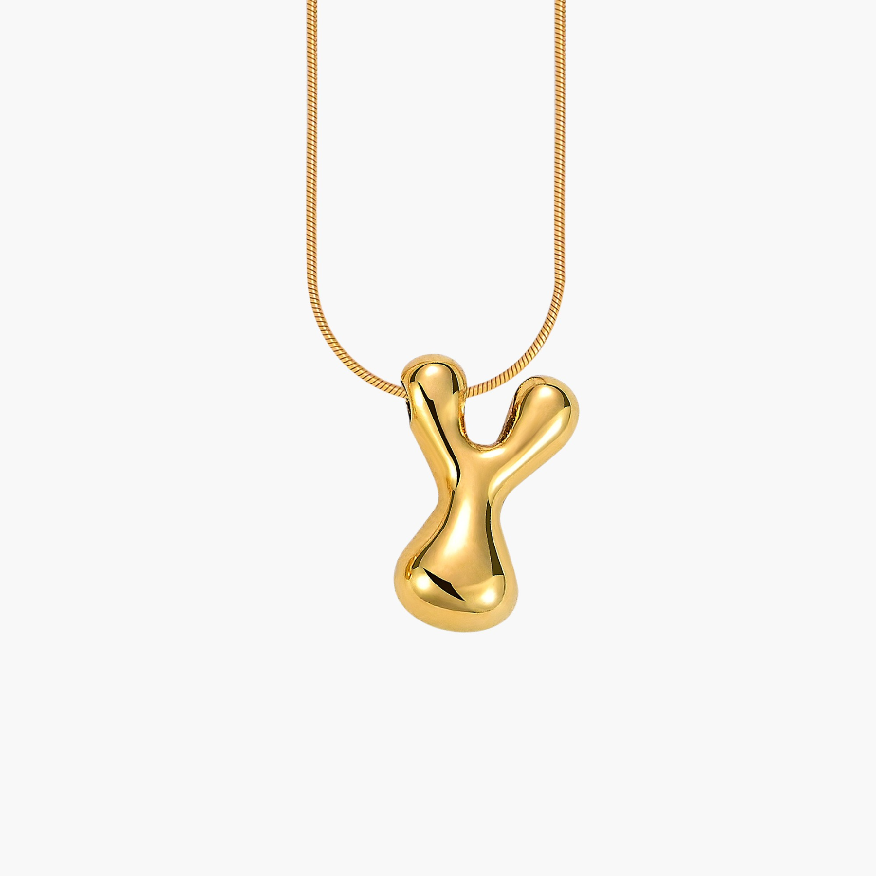 Haz una declaración con la elegancia juguetona del Collar de Letras de Burbujas en Brillo Dorado. Presentando un encantador colgante de letra en estilo burbuja, esta pieza está elaborada con un acabado dorado radiante que capta la luz con cada movimiento.