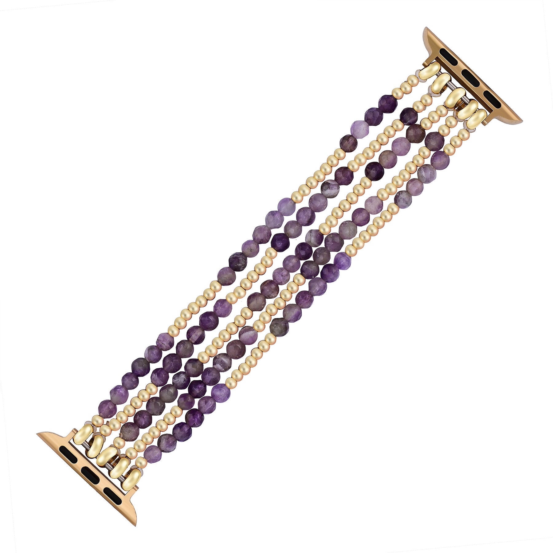 Disfruta de la belleza de la amatista con la correa elástica Golden Violet Amethyst para Apple Watch. Esta impresionante pulsera presenta cuentas de amatista de un púrpura profundo y acentos dorados brillantes, creando un aspecto sofisticado y elegante.