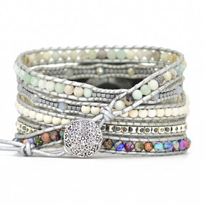 - Materiales: Jaspe Imperial, Piedras Naturales de Amazonita, Cuero Genuino, Acero Inoxidable y Aleación de Zinc