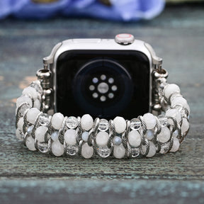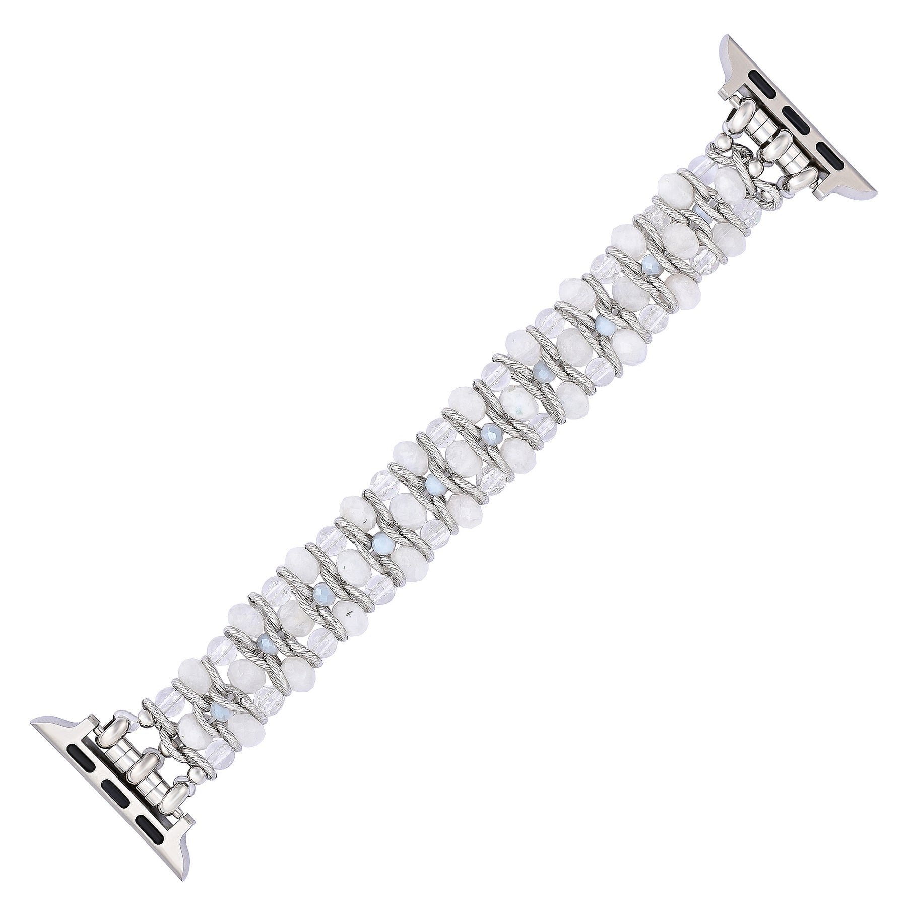 Eleva tu Apple Watch con la correa Moon Mirage Trenzada Elástica para Apple Watch, una mezcla perfecta de belleza celestial y sofisticación moderna. Esta exquisita correa presenta cuentas de piedra lunar que capturan el resplandor etéreo de la luz de la luna, complementadas con eslabones de cadena en tono plateado para un look elegante y versátil.