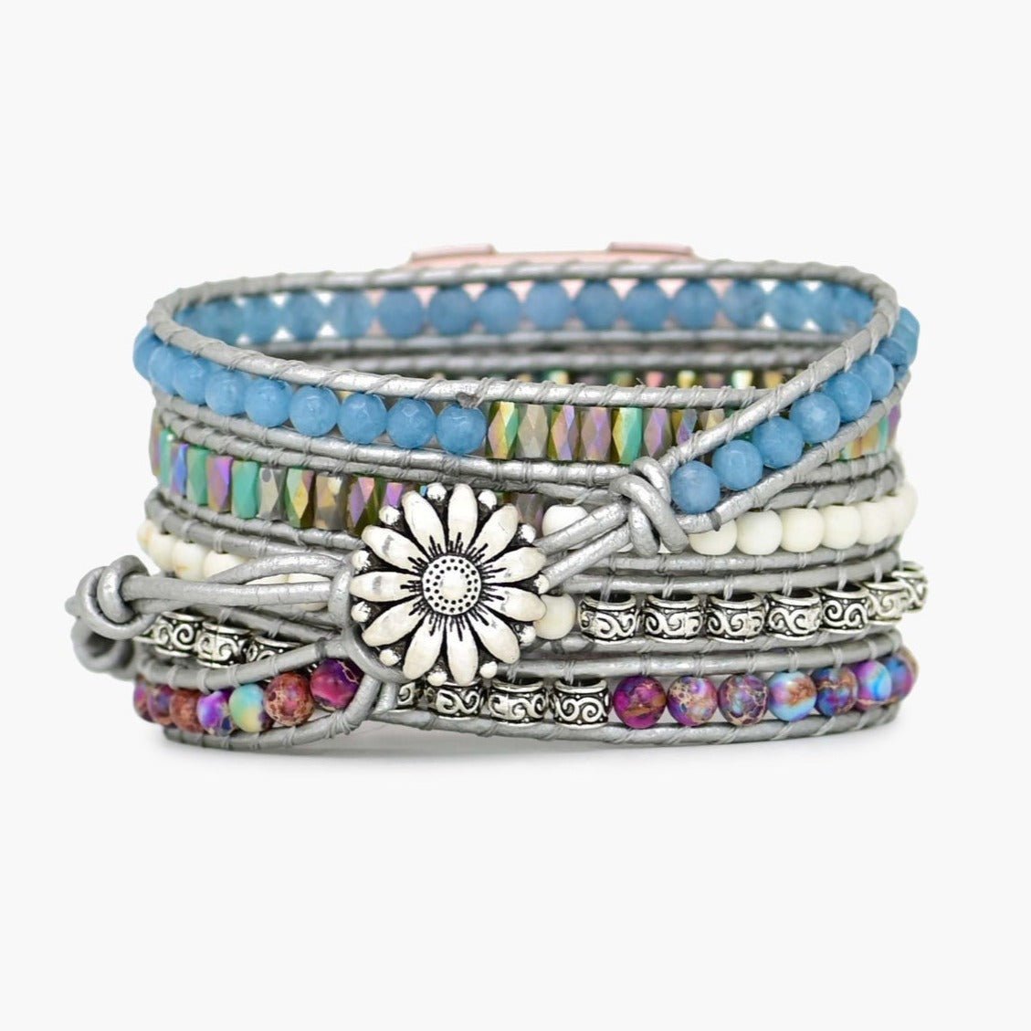 - Materiales: Ocean Jasper, Emperor Jasper, Howlite, Cristal, Piedra con imagen, Cuero genuino, Aleación