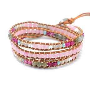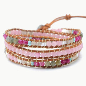 - Materiales: Cuarzo Rosa, Labradorita, Ágata, Cuero Genuino y Cierre de Acero Inoxidable