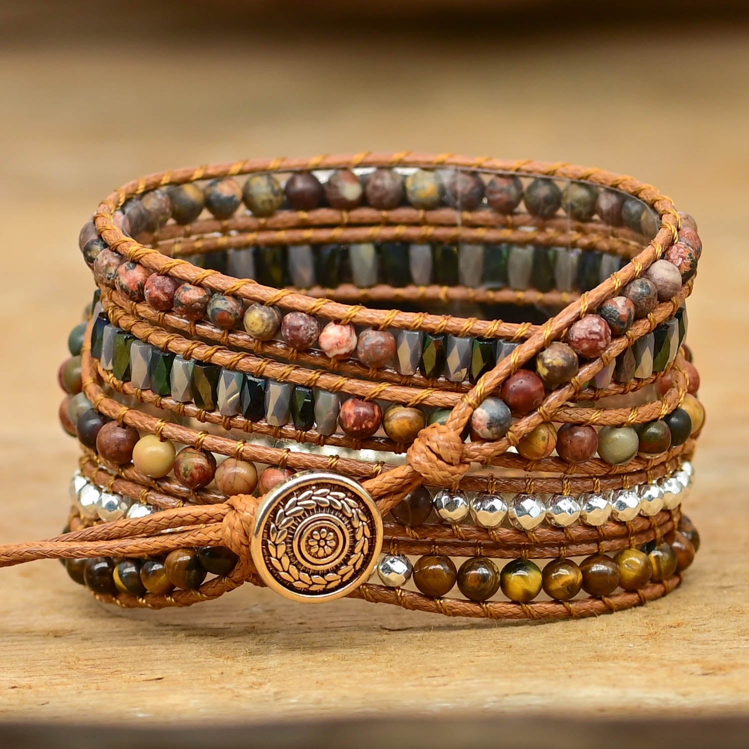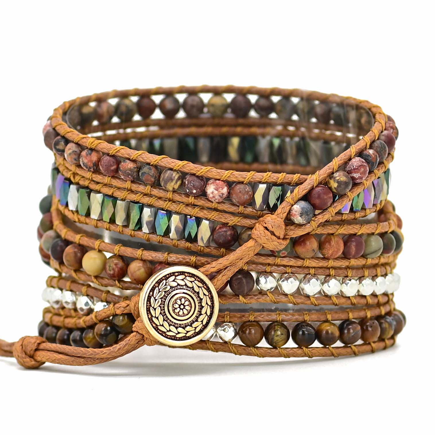 • Materiales: piedra Emperor, cristal, ágata, cuenta de aleación, piedra ojo de tigre, cuerda de cera, acero inoxidable y aleación de zinc