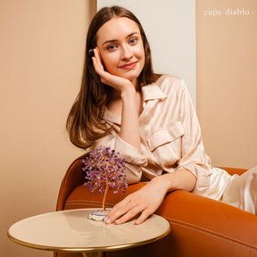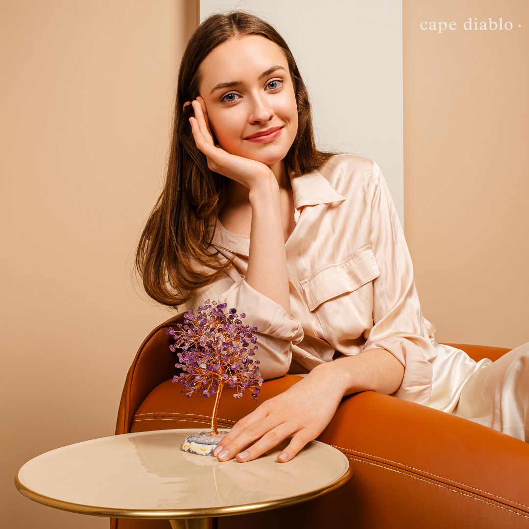 El Árbol de la Vida de Amatista irradia energía pacífica y claridad espiritual. Con sus ricos gemas púrpuras que simbolizan sabiduría e intuición, esta pieza elegante fomenta la calma, el equilibrio y la armonía interior, perfecta para cualquier hogar o espacio de meditación.