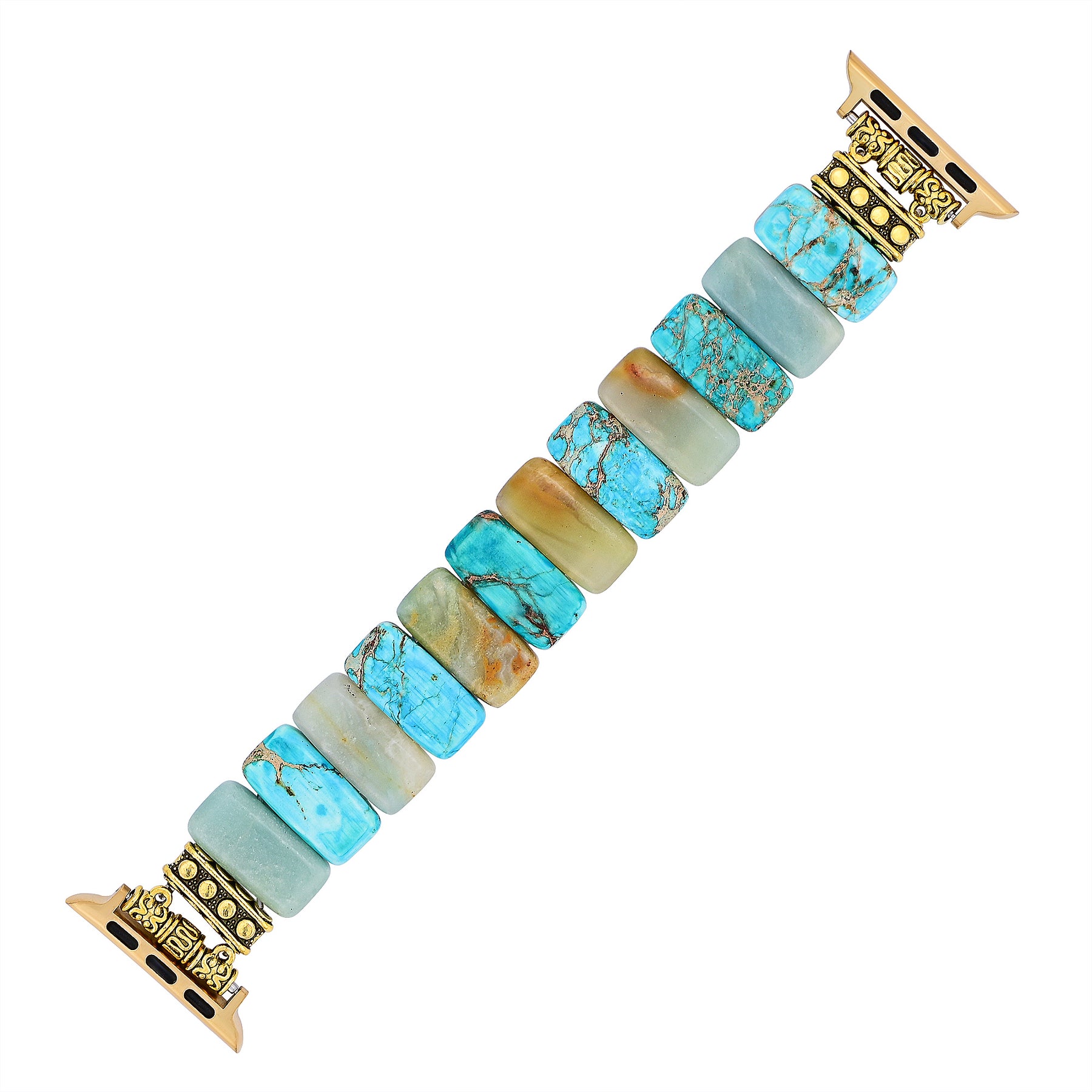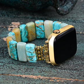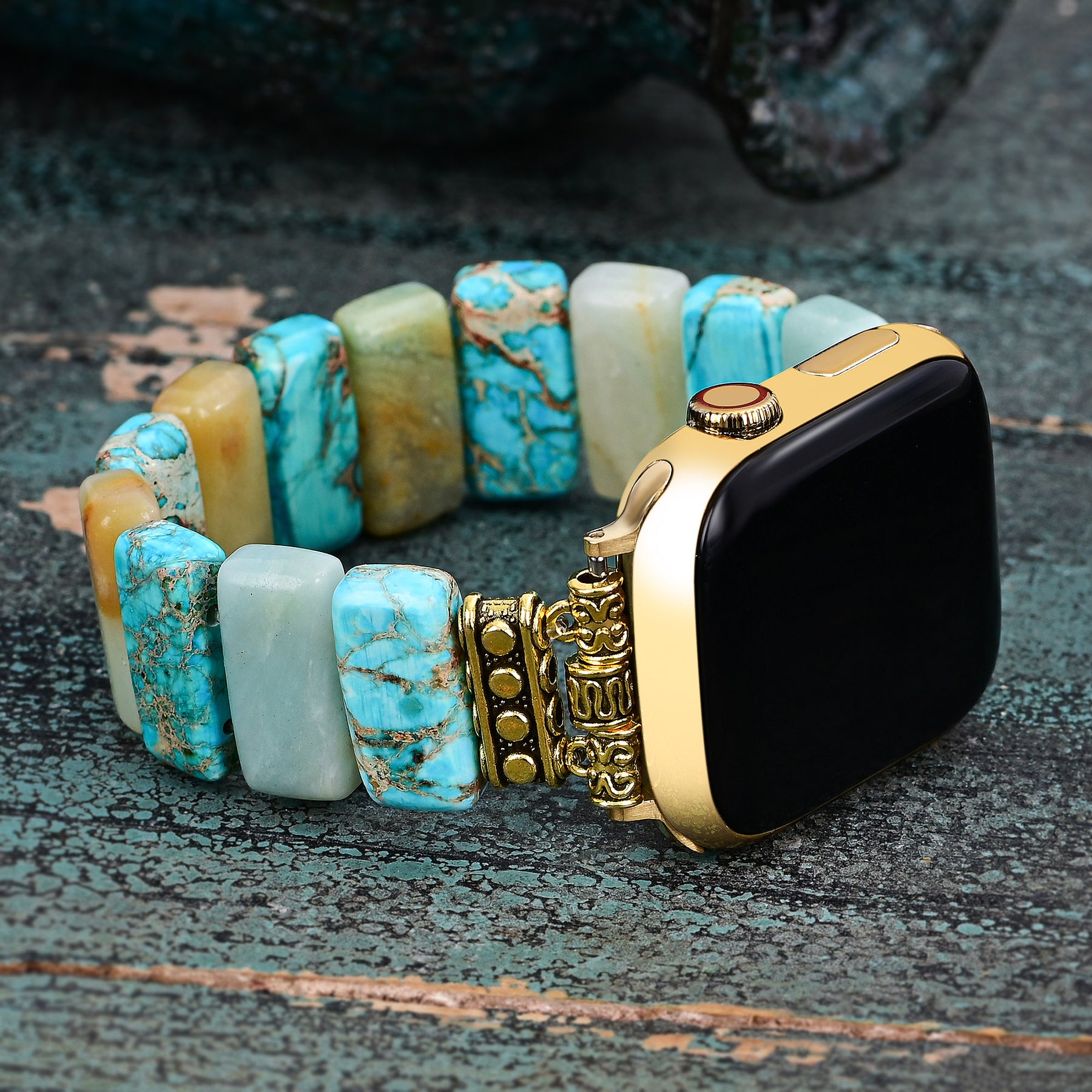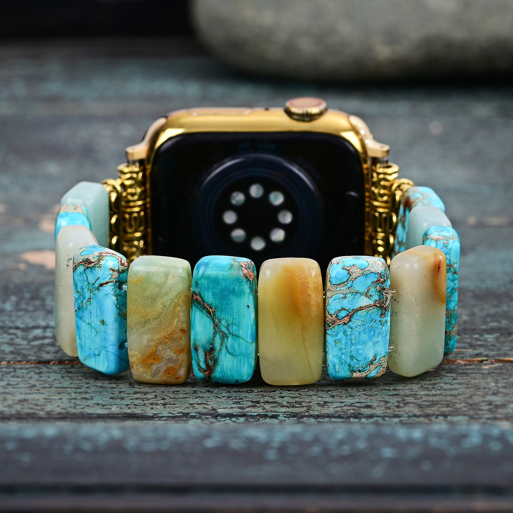 Eleva tu estilo con la correa Turquoise Earth Stretch para Apple Watch. Este impresionante accesorio combina la belleza natural de las piedras turquesa con la funcionalidad moderna.