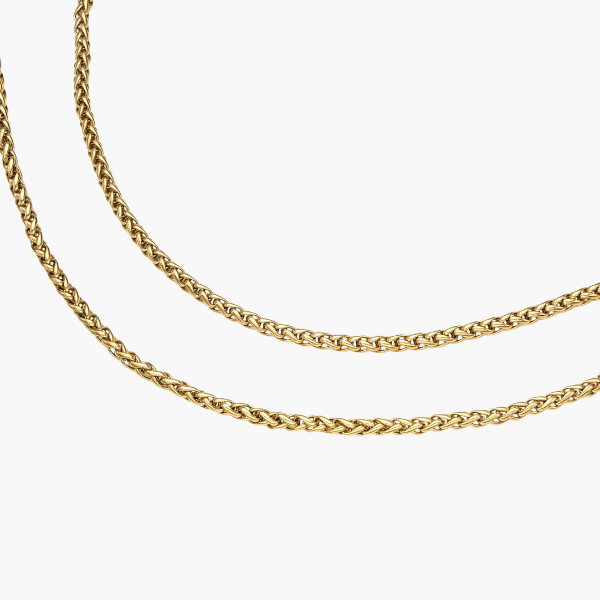 Lleva tu estilo al siguiente nivel con la Cadena de Trigo (Oro) de 3mm. Cuatro hilos de oro de 18K y acero inoxidable se entrelazan para ofrecer una calidad superior que resiste el paso del tiempo. Resistente al agua, al calor y al sudor, e hipoalergénica, es un look clásico que no te defraudará. ¡Lúcela sola o apílala, la elección es tuya!