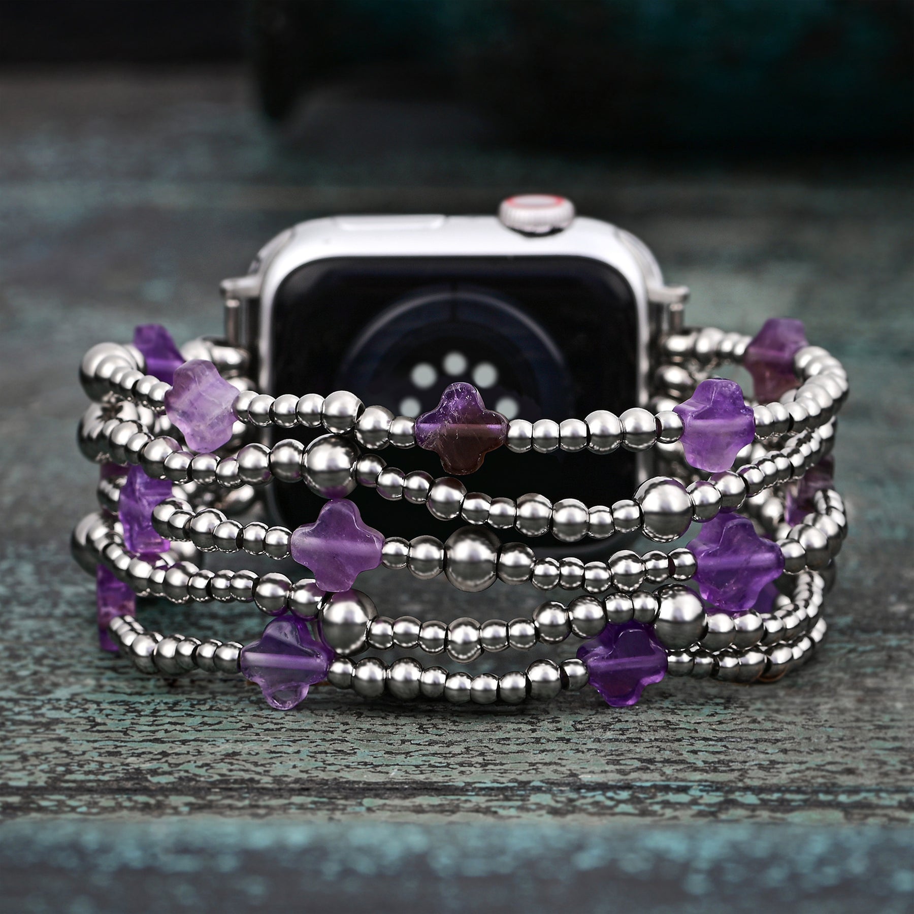¡Eleva tu estilo en la muñeca con un toque de belleza celestial! La correa Celestial Charm Cross Stretch para Apple Watch presenta cuentas plateadas radiantes y una piedra cruz morada serena, combinando elegancia espiritual con un estilo atemporal.