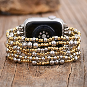 ¡Añade un toque de lujo a tu muñeca con la correa Eternal Glow Stretch para Apple Watch! Elaborada con una impresionante mezcla de cuentas plateadas y doradas, esta correa aporta una sofisticación sin esfuerzo a cualquier look.