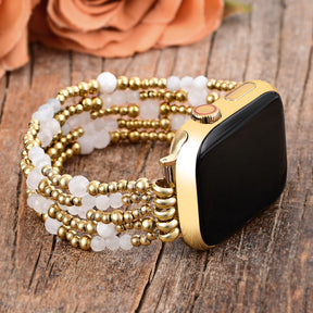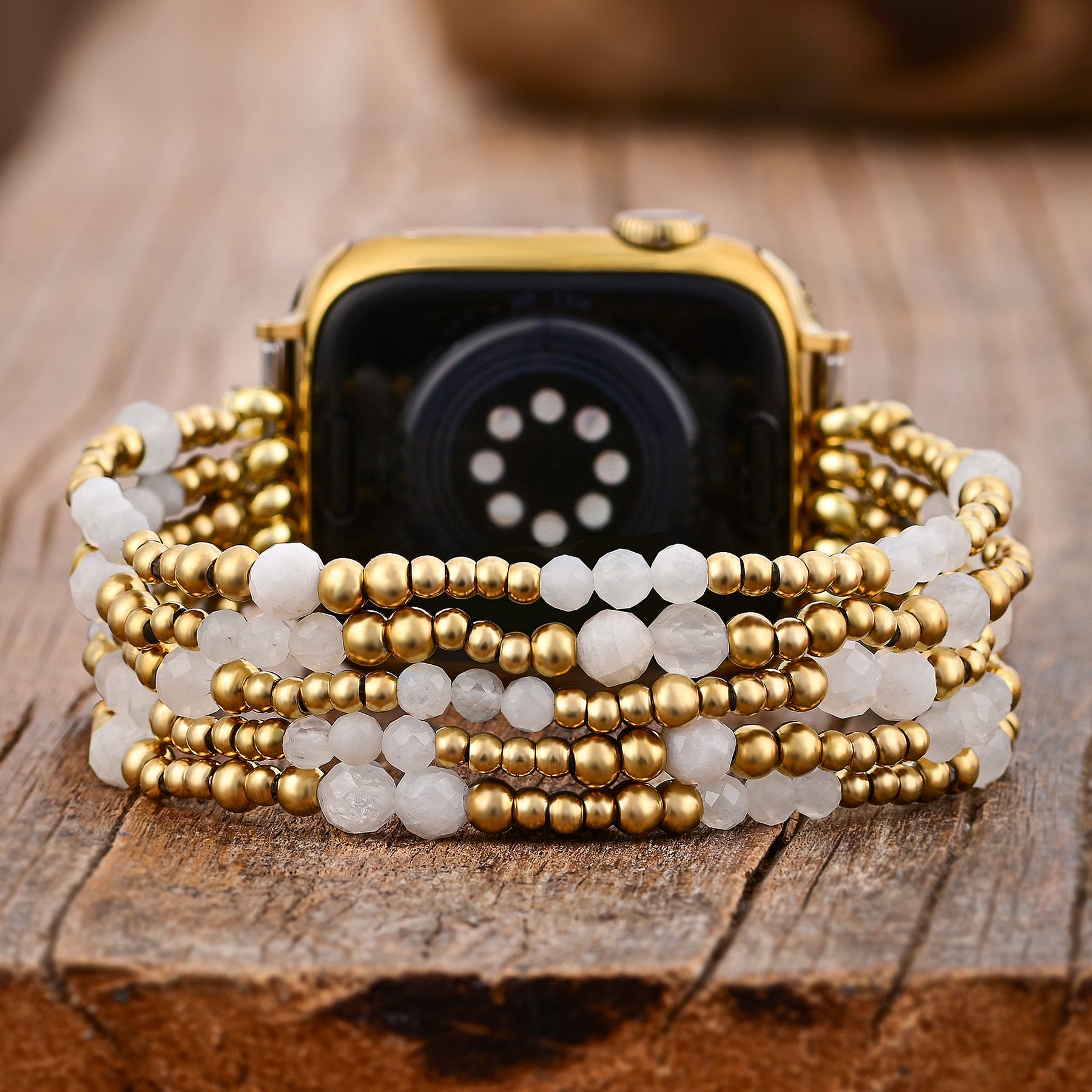 Irradia elegancia y misticismo con la correa Golden Halo Moonstone Stretch para Apple Watch, una cautivadora mezcla de belleza celestial y diseño lujoso. Las cuentas de piedra lunar que brillan captan la luz con cada movimiento, mientras que los acentos chapados en oro añaden un toque de opulencia para un equilibrio perfecto entre elegancia atemporal y estilo moderno.