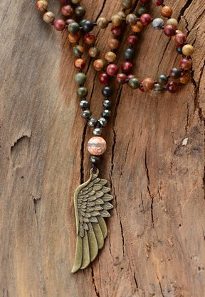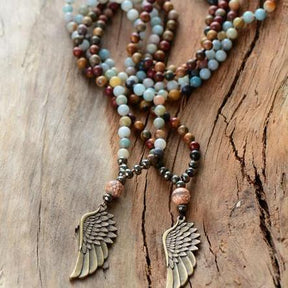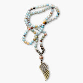 The Angel Wing Necklace features amazonite to awaken hope and compassion by supporting the heart chakra and guiding your spirit toward clarity. Paired with grounding jasper, it offers protection, emotional balance, and a sense of calm amidst life’s uncertainties.