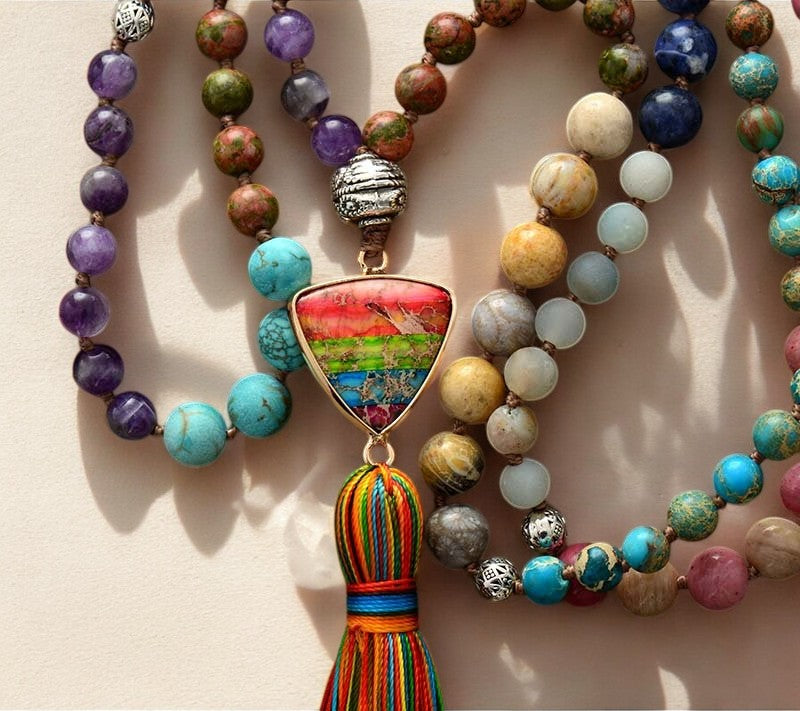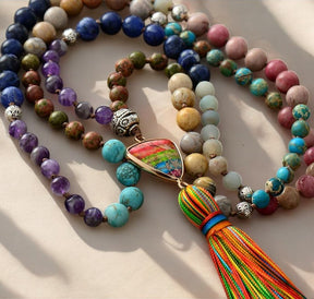 The Chakra Charm Tassel Necklace combines the calming powers of Amethyst, the protective energy of Jasper, the intuitive guidance of Turquoise, and the compassionate healing of Rhodonite. Each stone supports a balanced energy flow, promoting peace, creativity, and love while harmonizing your chakras.