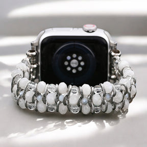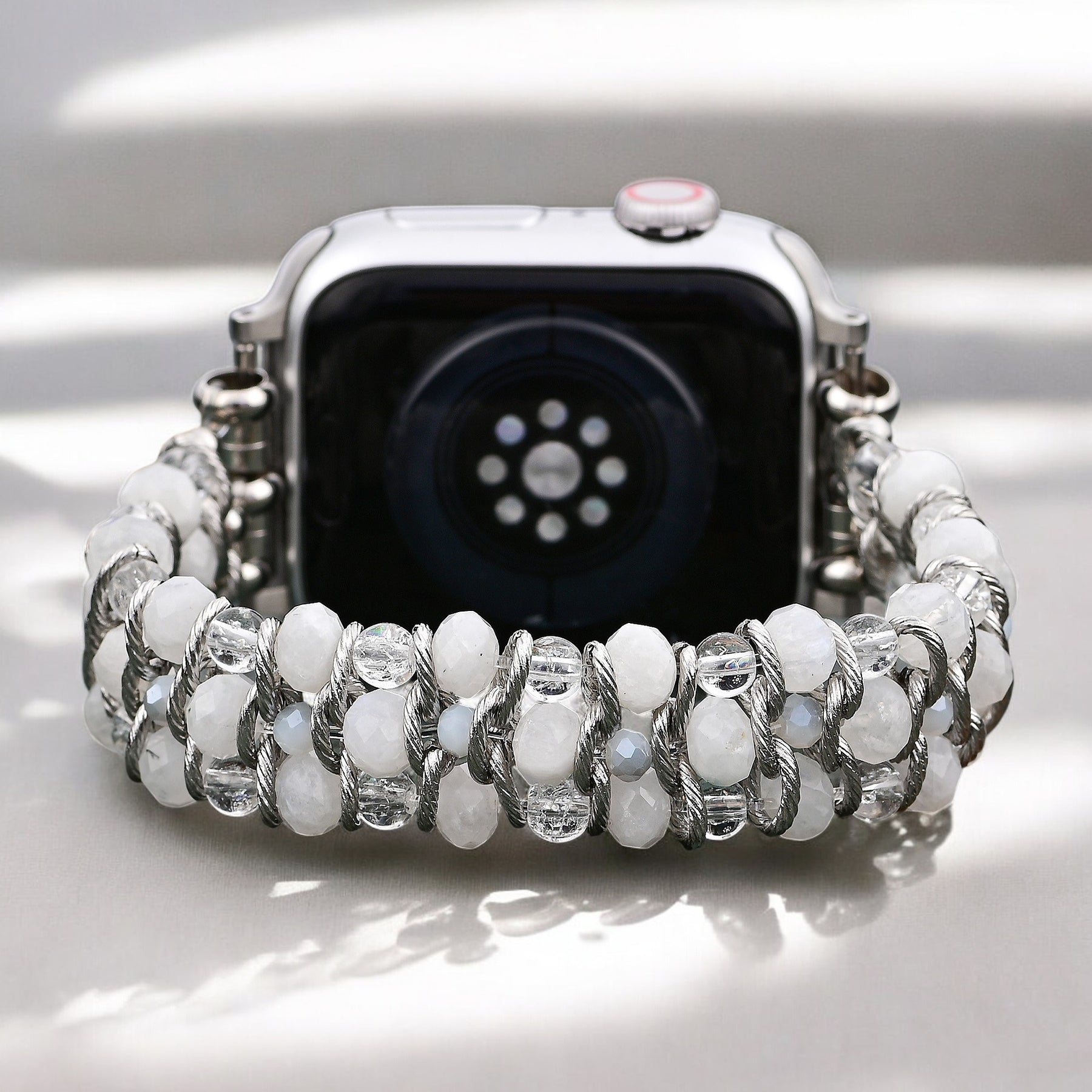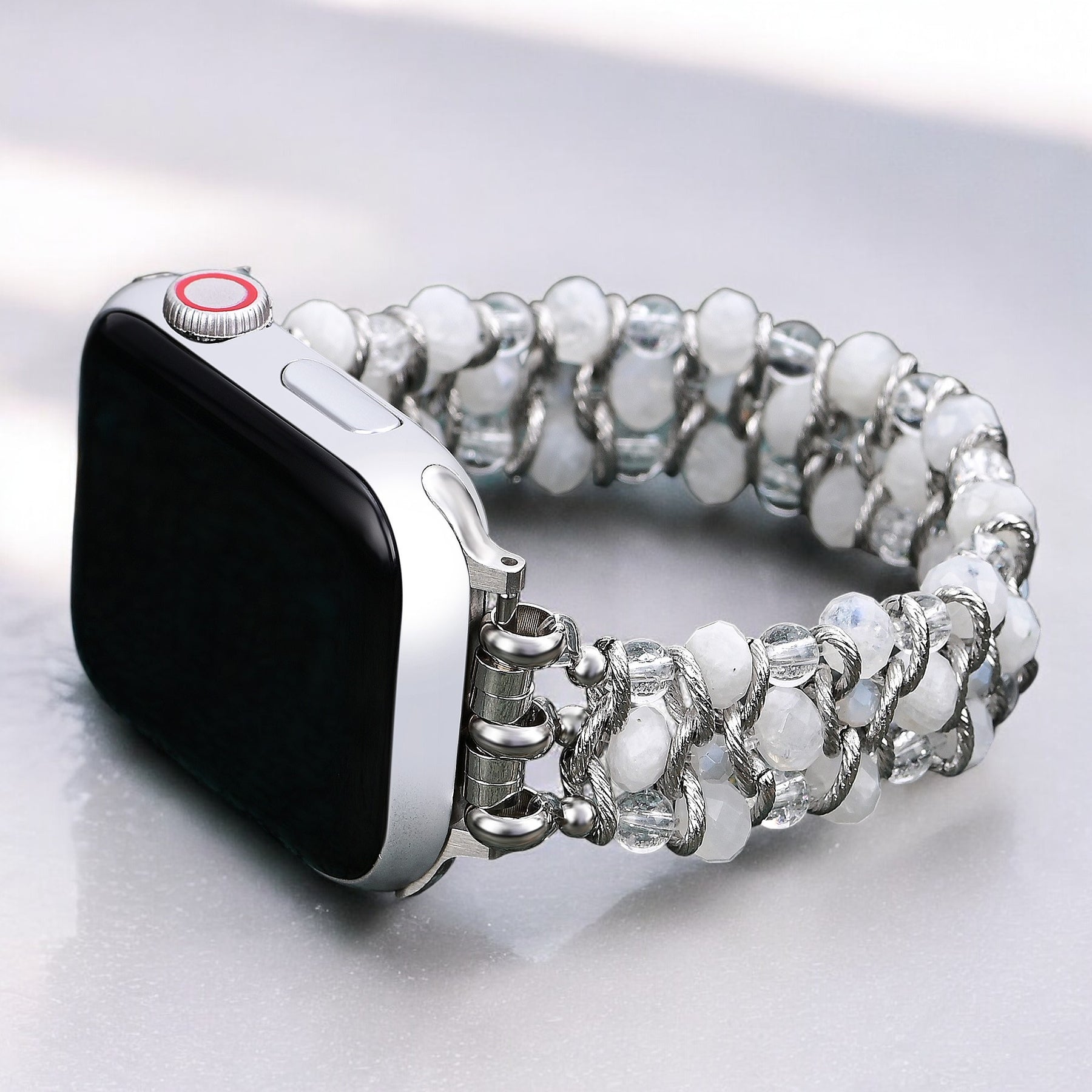 Elevate your Apple Watch with the Moon Mirage Braided Stretch Apple Watch Strap, a perfect blend of celestial beauty and modern sophistication. This exquisite strap features shimmering moonstone beads that capture the ethereal glow of moonlight, complemented by sleek silver-tone chain links for a chic and versatile look.