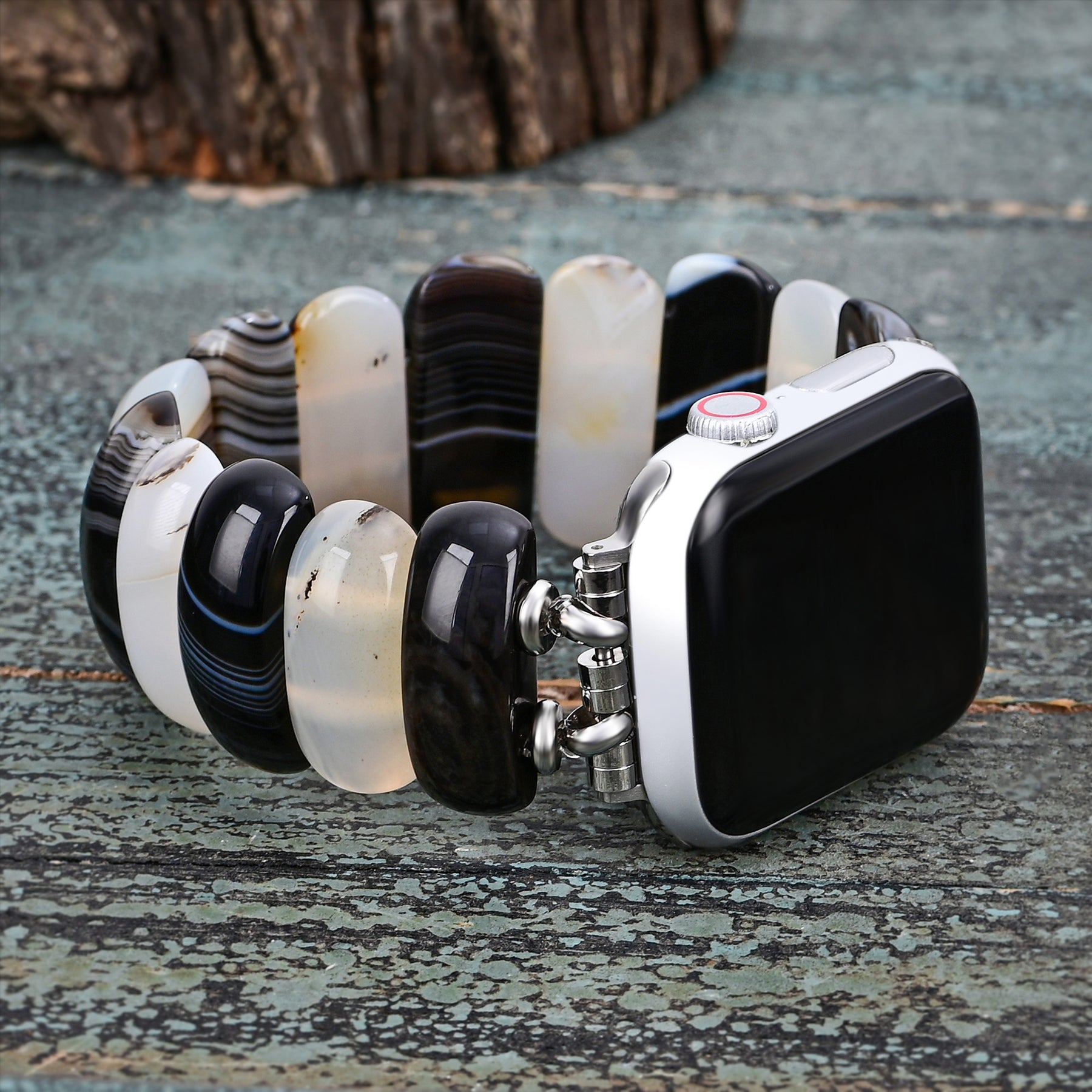 Embrace the perfect balance of mystery and elegance with the Obsidian Frost Agate Stretch Apple Watch Strap. Featuring a sleek black and white marble pattern, this design is inspired by the raw beauty of volcanic obsidian, creating a bold yet sophisticated look.